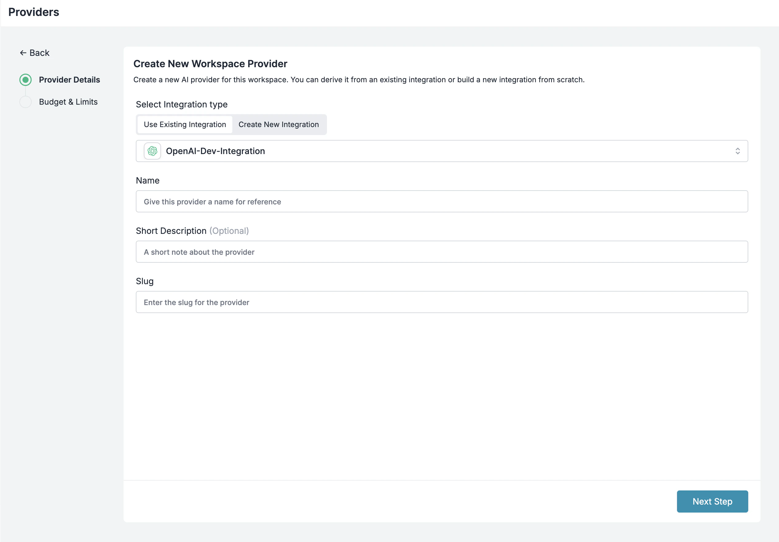Select your provider (OpenAI, Anthropic, etc.), enter your API key, and create a slug like openai-prod.