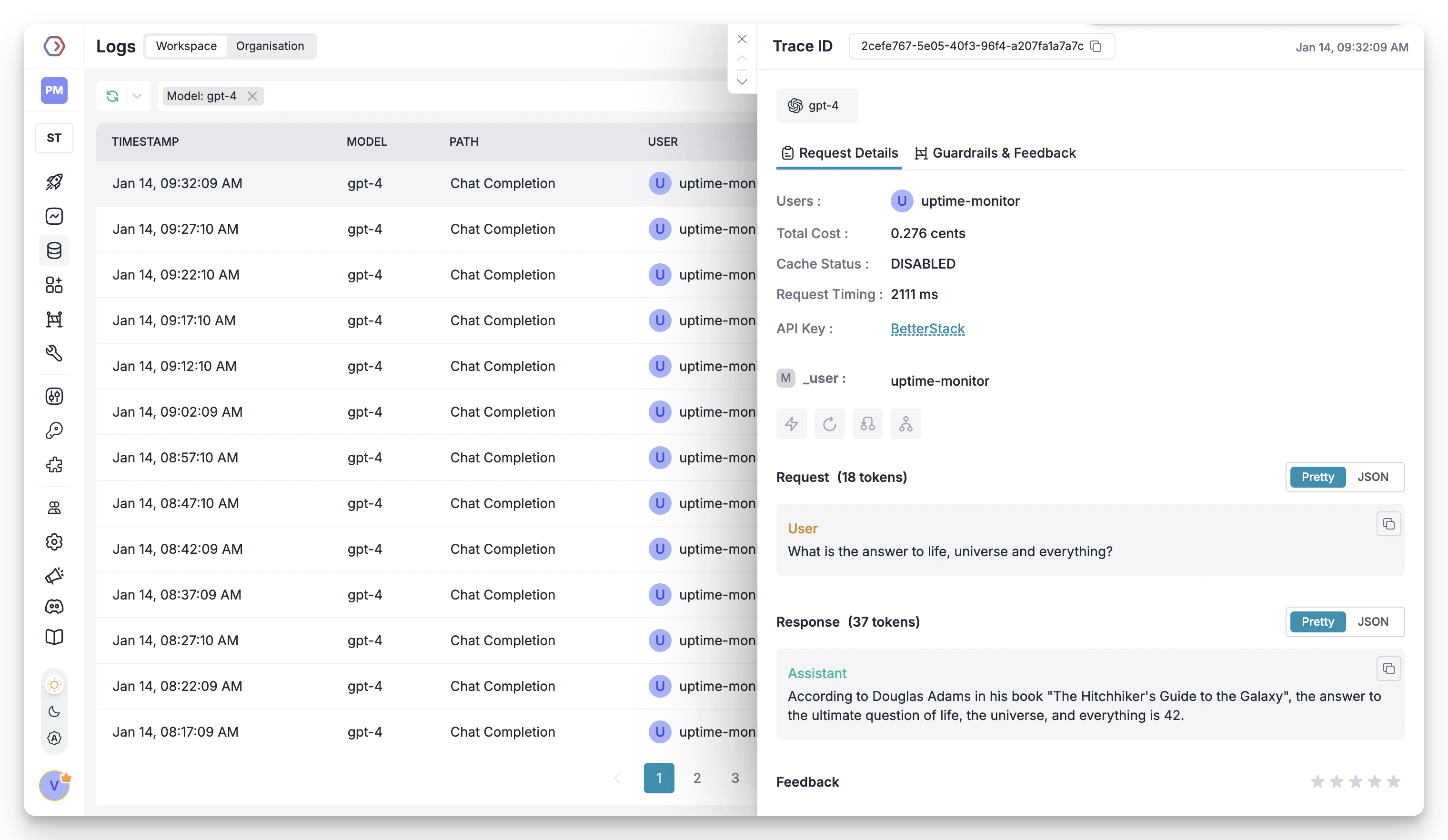 Portkey’s logging dashboard provides detailed logs for every request made to your LLMs. These logs include: